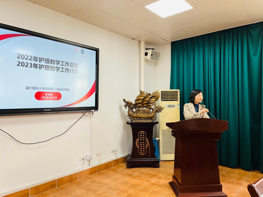 副院长杨晔琴向学院老师一年来的默默奉献表示感谢。她从教务考务安排、教学建设、实践教学、实验室安全等方面对2023年教学重要工作作部署。同时,结合教育部文件精神以及学院教学工作实际,她对教学工作计划、不同微专业的开设、毕业预警的梳理帮扶、上半年教学会议的举办、临床护理教学质量的控制、教学成果的凝练等重难点工作提出新要求。