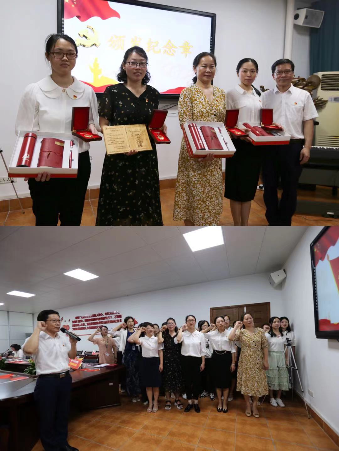 现场开展了“珍藏这一天”入党纪念日活动,为今年入党35周年的邱莲珍同志、入党20周年的梁洁华同志、高歌心同志以及入党10周年的项彬彬同志党员过政治生日,颁发入党纪念章和纪念品。4位生长在不同年代的党员从不同角度分享了自己的人生经历和感悟,纷纷感谢党给自己带来的机遇和成长,表示没有党,就没有自己的今天,还结合本职工作表示要加强学习、增强意识、作出表率。话语间真情流露,不时热泪盈眶。在李旭东书记的带领下,全体党员面对党旗,握紧右手,以铿锵有力的宣誓声重温入党誓词,表达对党的忠诚和坚定不移跟党走的信念。