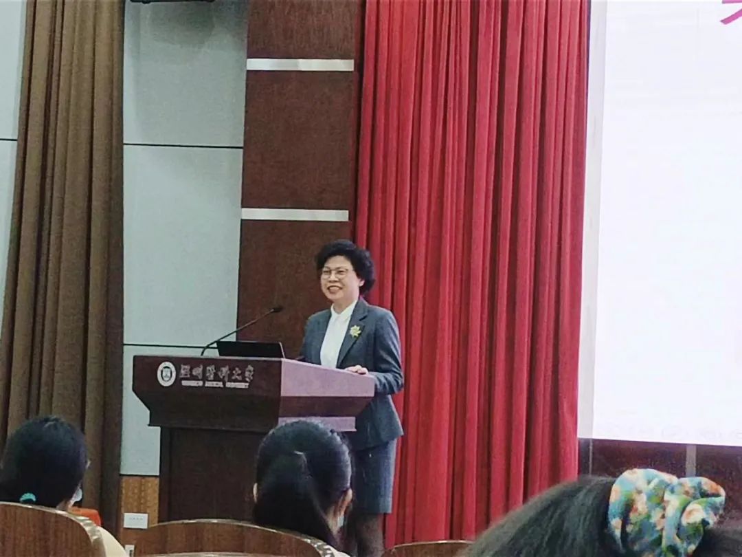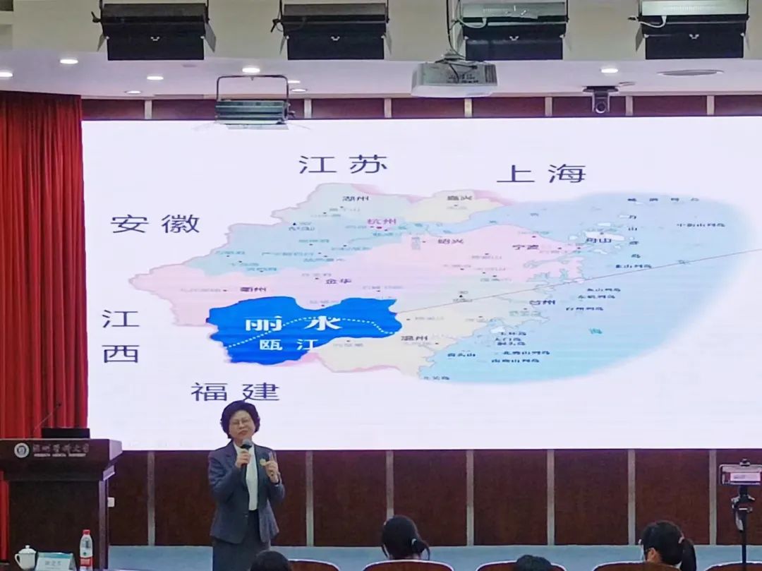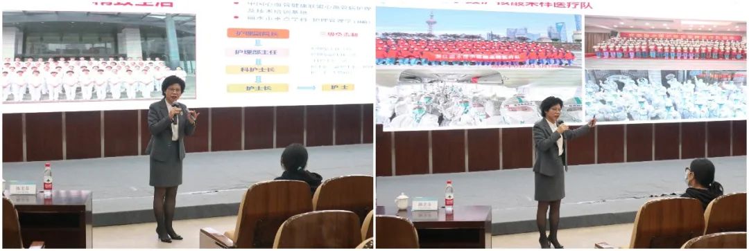 陈美芬副院长以丽水市的秀美风光与玉石文化为启,引出了丽水市中心医院的精巧布局和护理精神。她从医院护理管理、医院护理建设两大方面给同学们作分享。