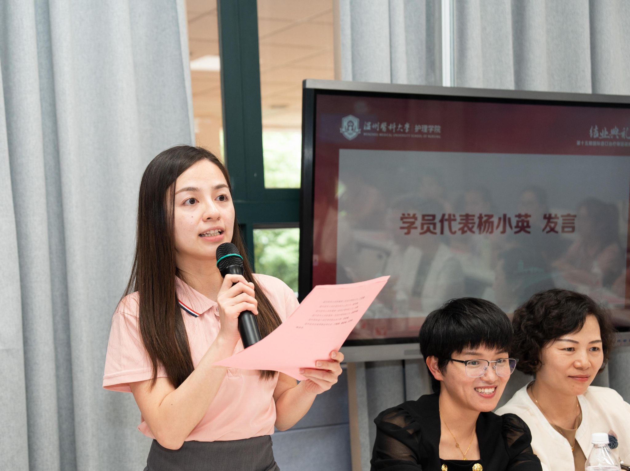 来自澳门的学员代表杨小英发言,对老师们的辛勤付出表示感谢,并表态将把学校所学到的知识和技能运用到实践中,为造口伤口专业的发展贡献力量。