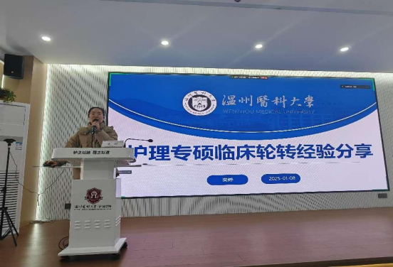 2023级护理研究生代表奕婷分享了她的临床培训经验,在科室实践期间要保持谦虚、礼貌,主动学习,把握实操机会,积极参与医院的学术活动。