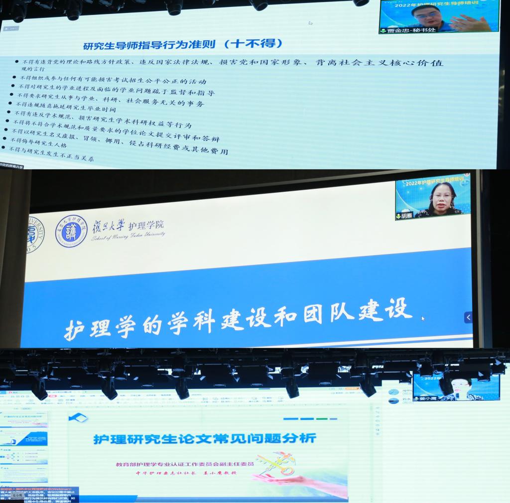 全国医学专业学位研究生教育指导委员会秘书处办公室贾金忠主任从研究生导师和研究生间的导学关系切入,基于研究生导师相关政策提出对新时期研究生导师的要求,并从护理学科管理、护理学科发展、护理科研、研究生培养目标与定位等方面阐述了对护理研究生教育改革的相关思考。胡雁教授以复旦大学taptap点点官网入口为例,介绍了护理科研团队建设。姜小鹰教授以研究生学位论文抽检中的常见问题为例,对问题进行研判,并提出针对性建议。