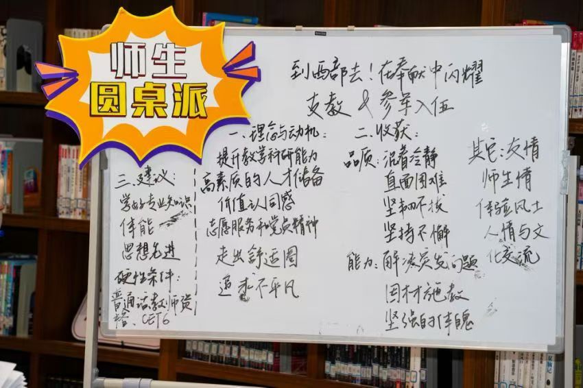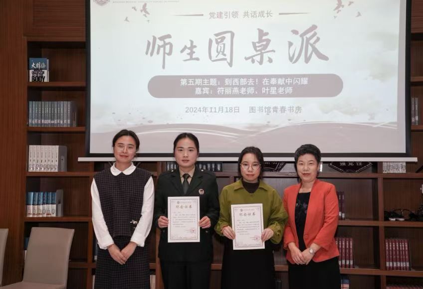 第五期师生圆桌派于11月18日下午在图书馆青春书房成功举办,本次活动以“到西部去!在奉献中闪耀”为主题,通过师生分享支援西部经历,共同探讨宝贵经验,更好奉献社会。本次活动嘉宾为taptap点点官网入口符丽燕老师、叶星老师,肖芳同学、陈嘉泓同学,现场观众由学生党员、入党积极分子代表及线上2024级大一新生组成。