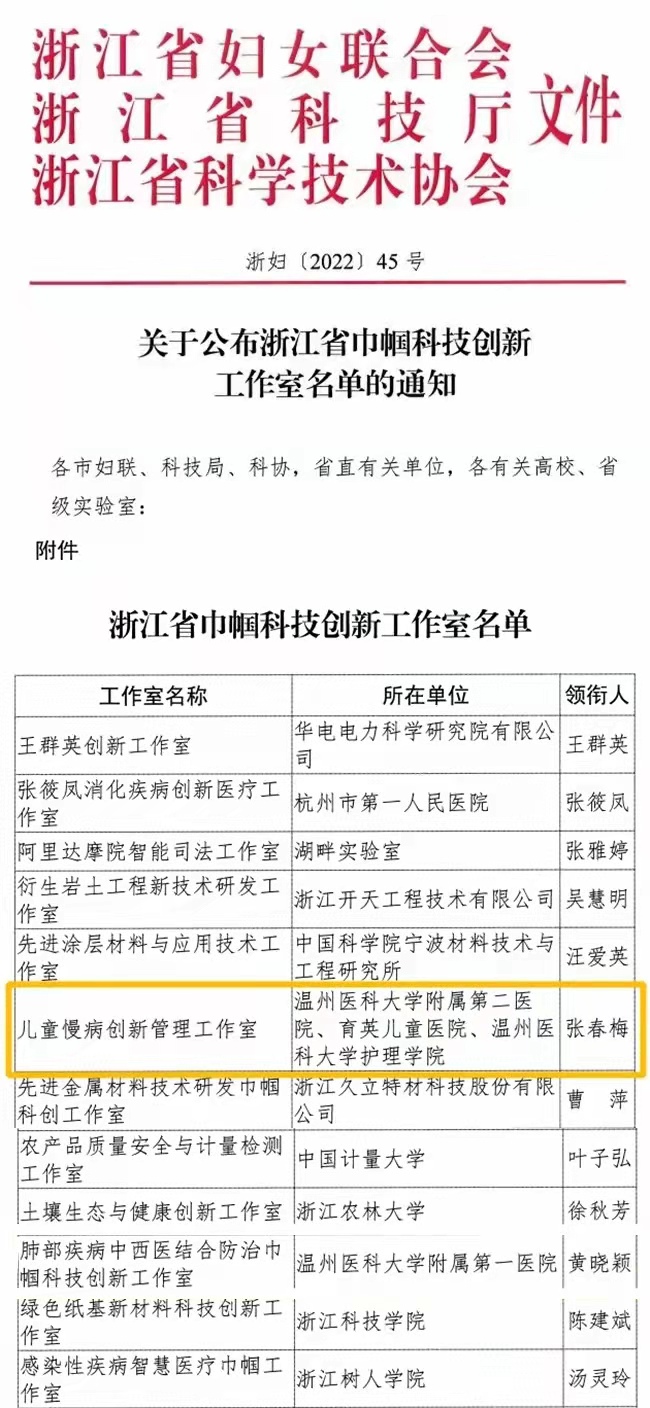 为深入贯彻落实浙江省第十五次党代会和全省科技创新大会精神,持续深化科技创新巾帼行动,推进女性科技人才为奋力推进“两个先行”贡献巾帼力量,近日,省妇联、省科技厅、省科协联合发文公布了“浙江省巾帼科技创新工作室”评选结果,taptap点点张春梅副院长的“儿童慢病创新管理工作室”榜上有名,可喜可贺!