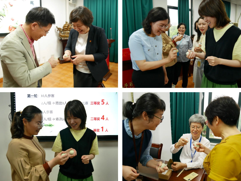 “粽”会欢乐,欢乐撞蛋游戏。撞蛋开始前老师们积极讨论战术,细心挑选属于自己的鸭蛋。在撞蛋的比拼中,老师们积极参与,会议室中充满了欢声笑语。两蛋相撞,蛋破碎的那一清脆的响声格外悦耳,撞蛋胜利的老师也会像孩子般高兴的跳起来,喜悦之情溢于言表,学院也为撞蛋优胜的老师准备了精美的礼品。赛后老师们意犹未尽,纷纷还展开了友谊赛,蛋破碎的声音以及欢笑声弥漫着整个房间。