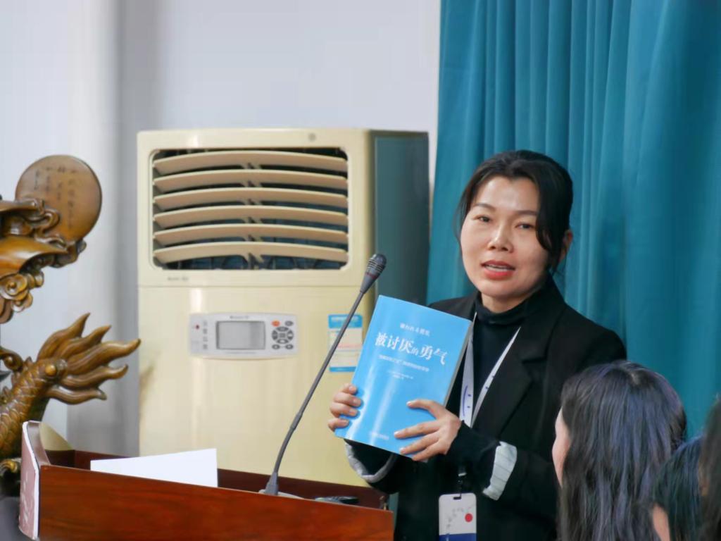 陈海燕老师作阅读分享,她分享了《被讨厌的勇气》一书。她从书中一位青年和一位哲人之间的五夜对话,分享了心理学大师阿德勒的人生思想,也分享了她的阅读感悟,启发我们用一个新的视角看待日常情绪、自我认知、人际关系处理等。