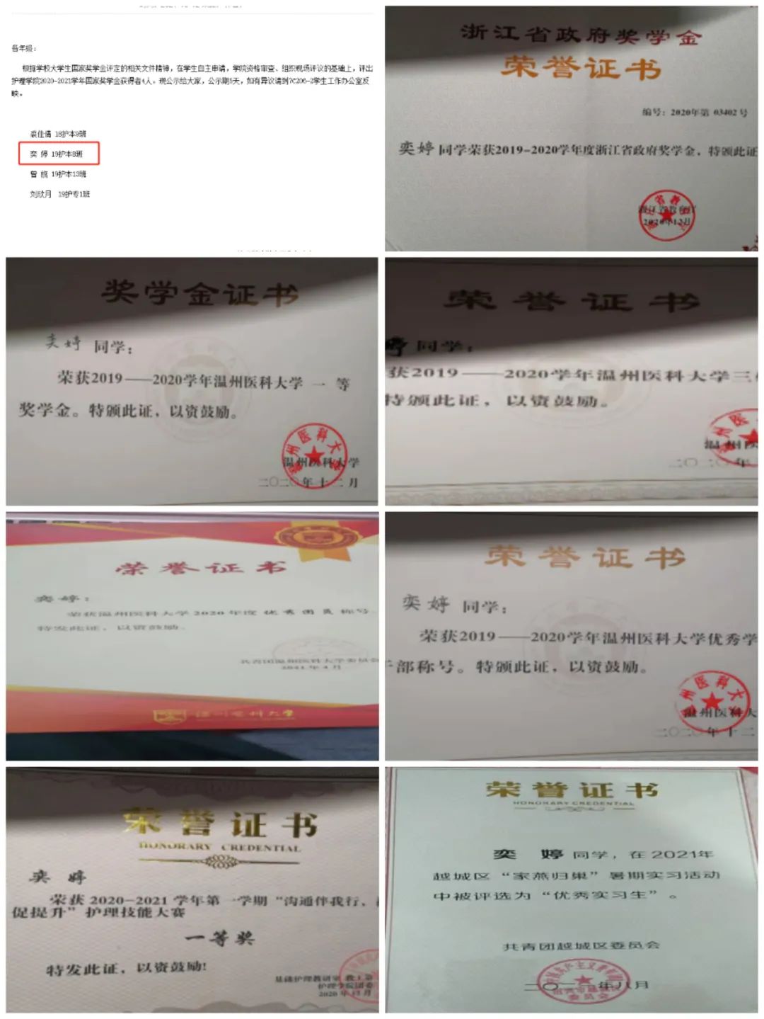 就读护理四年本科专业,她累计获得国家级奖学金、省政府奖学金、校一等奖学金;荣膺校优秀学生干部、优秀团员、优秀学生干部、优秀三好学生等称号;获得“沟通伴我行,视频促提升”护理技能大赛一等奖、三行情书创作活动优秀奖、暑期社会实践“优秀实习生”等多项荣誉。她积极主动,将学习与校园生活一并于心,争做优秀温医追梦人。