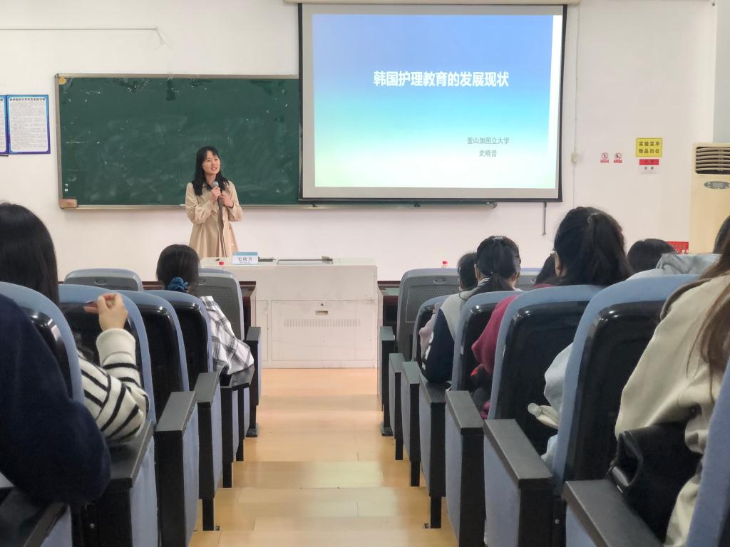 史晓普就“韩国护理教育的发展现状”作主题演讲,她带领大家了解了韩国护理教育的发展与韩国釜山加图立大学的护理发展史,具体介绍了韩国护理教育历经的5个阶段,并对釜山加图立大学护理课程设置、选课要求、申请博士入学资格、毕业后的就业方向进行了详尽阐述,不仅开拓了与会学子的视野,也为有继续深造需求的同学提供了参考。