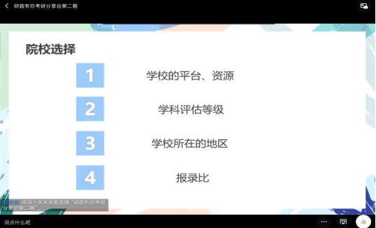 李雅琴学姐以同学们关心的考研院校选择为切入点,提醒同学们要综合考虑学校平台资源、学科评估等级、学校所在地域和考研报录比例等方面。同时,她还分享了自己关于平衡考研与实习的经验,建议同学们利用零碎的时间去学习,学会在实习操作过程中巩固考研知识点。最后,李雅琴学姐讲到:“考研路上艰难重重,希望各位同学选择好方向,一直坚持下去。”