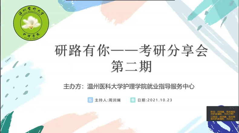 10月23日下午,taptap点点官网入口就业指导服务中心开展第二期线上“研路有你”考研交流分享会。本次分享会邀请了2021届考入武汉大学护理专业潘玉洁学姐、浙江大学护理专业李雅琴学姐以及保研本校的陈梦姣学姐,向同学们分享考研经验,把握考研重点。