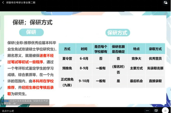 陈梦姣学姐为大家介绍了保研条件及流程。她建议同学们要清楚定位,明确目标,多了解、多报名、多尝试。同时,她鼓励学弟学妹们积极做科研、参加社会实践等为自己的将来奠定基础。陈梦姣学姐由繁入简的介绍了保研需要关注的地方,每位同学都深受启发。