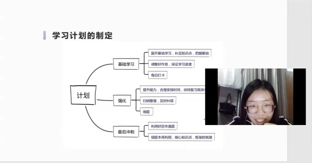 蒋可欣学姐以“升本报名指南”为主题,通过思维导图的方式,为同学们详细介绍了考试报名时间、报考要求及考试科目,让同学们对报考流程、招生计划、院校选取等方面有了更加清晰的认识。