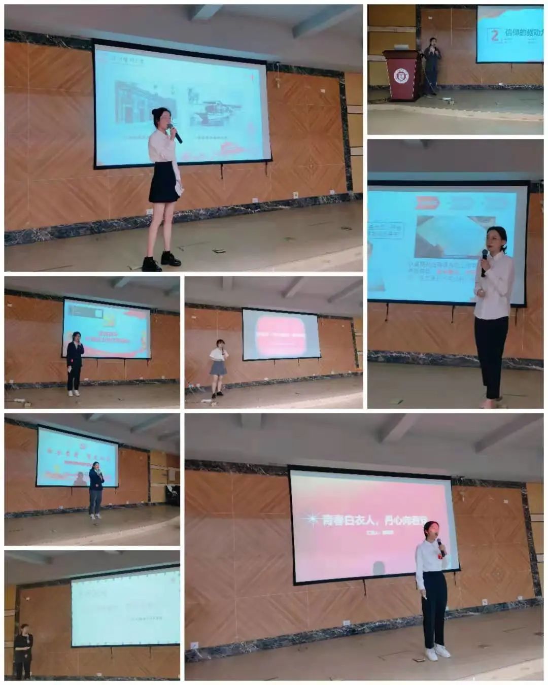 微党课大赛得到同学们积极踊跃的报名参与,初赛共收到31份参赛视频作品,经过专家评审最终16组选手入围现场决赛。选手们同台竞技、尽显风采。她们思路清晰、声情并茂,时而慷慨激昂,时而抒发情感,充分展示了护理学子的青春风采。故事中“大白”老师默默守护病人的健康、钟南山先生临危不惧的担当意识、护理人的南丁格尔信仰,将这其中所蕴涵的共产党人精神表现开来,给观众们带来了一堂堂有温度、有深度、有广度的微课。