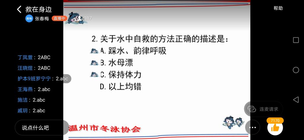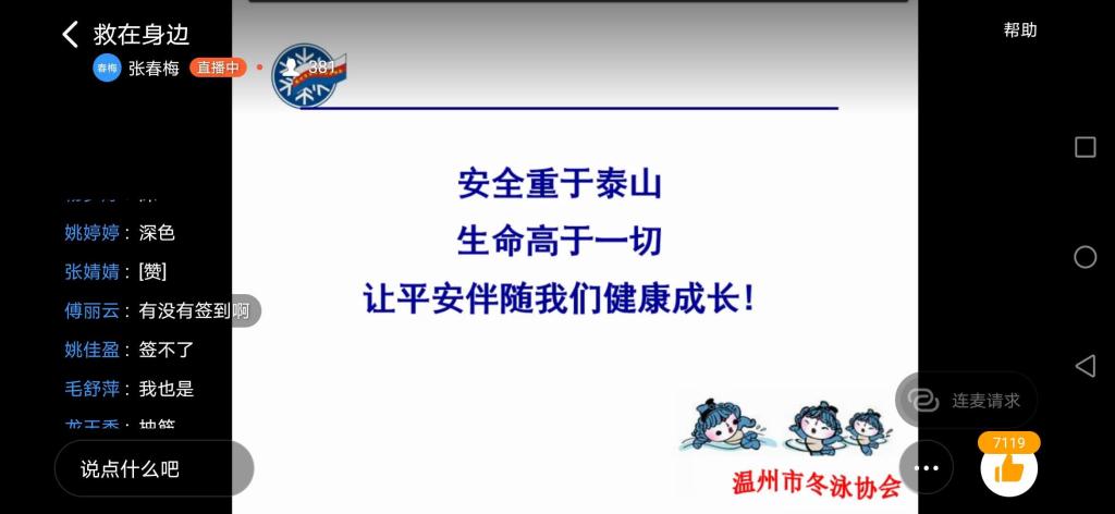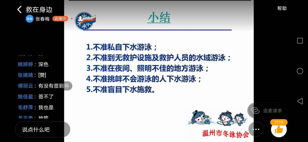 近日,我国多地出现大学生溺水事故。为进一步强化学生暑假安全教育工作,帮助学生树立安全意识,7月16日下午taptap点点学工办联合教工第一党支部举办“预防溺水、救在身边”主题直播讲座,特邀温州市冬泳协会荣誉主席、taptap点点副院长张春梅老师面向全院学生讲授暑期防溺水救护知识。