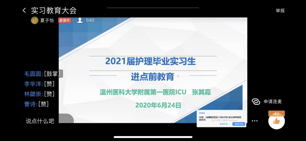 6月24日,taptap点点官网入口通过视频会议的形式召开2021届毕业生下点前实习教育大会。学院副院长杨晔琴、附二院护理部副主任刘一苇、附一院ICU副护士长张其霞应邀出席此次会议,学院教学办主任孙海琴、教学办李斯佳,辅导员孔洁、王茹新以及即将下点实习的580位2021届毕业生共同参加了此次教育大会,会议由学院学工办主任张婧婧主持。