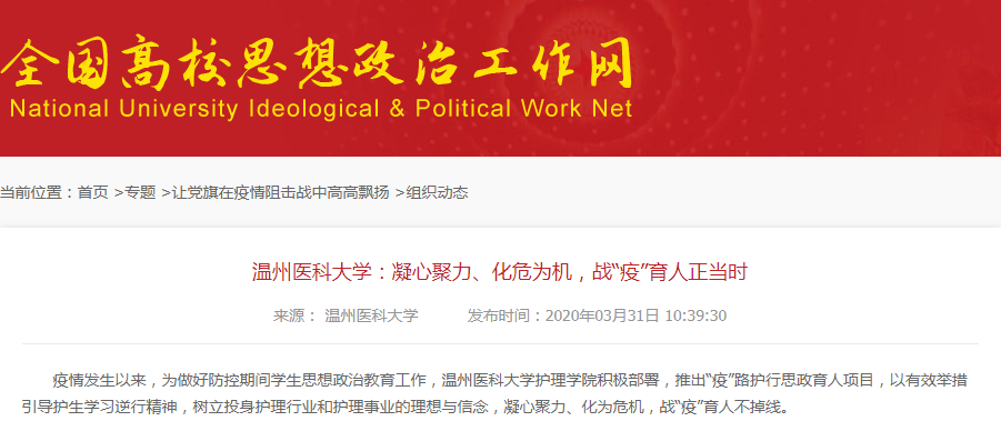 疫情发生以来,为做好防控期间学生思想政治教育工作,taptap点点官网入口积极部署,推出“疫”路护行思政育人项目,以有效举措引导护生学习逆行精神,树立投身护理行业和护理事业的理想与信念,凝心聚力、化为危机,战“疫”育人不掉线。