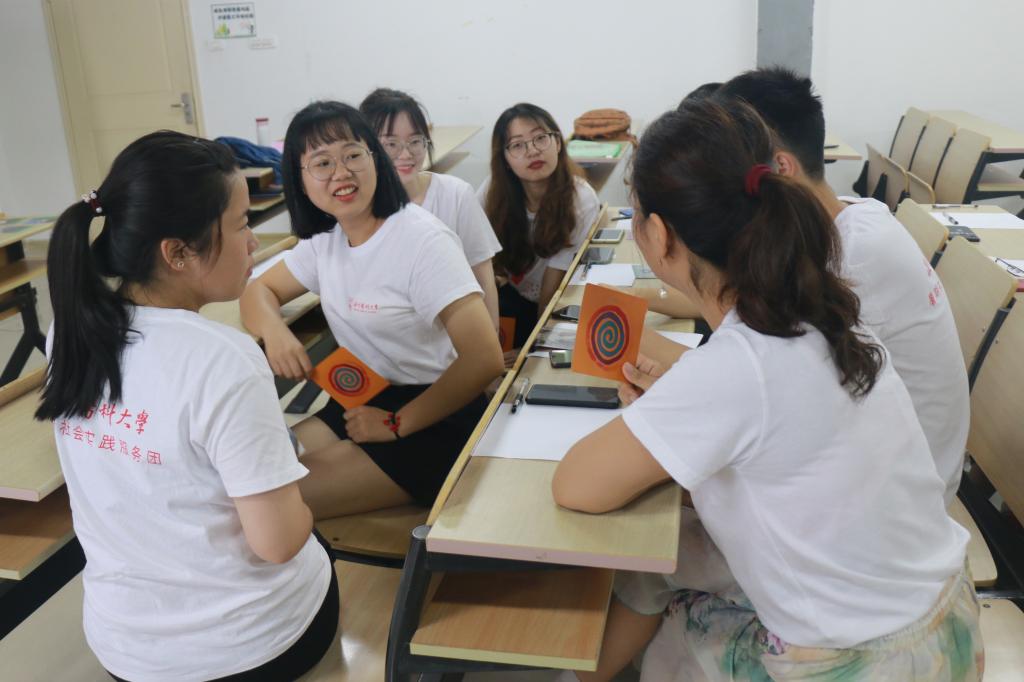 第二个游戏“动物卡片”,则将活动推向高潮。每个同学先是挑选了一张和自己比较像或是最喜欢的动物卡,后多次向不同的同学进行了自我介绍以及选择此张卡片的原因。同学们稍稍熟悉之后,又依据自己所选卡片中动物的生活环境,自行组队。最终,共组建六个小组,队名分别是“陆战队”、“海陆空联萌”、“洞头总动员”、“天上飞的”、“梦趋”和“包容”。组内成员互相自我介绍,并分享了选择这支暑期社会实践队的原因和对社会实践的憧憬。
