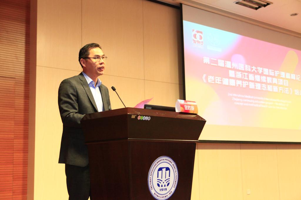 副校长金胜威致开幕辞,代表学校对与会领导、专家、同仁、老师的到来表示诚挚的欢迎和感谢,同时希望与会专家和同仁为我校护理学科建设和人才培养把脉问诊,推进我校实现护理学科和专业的新跨越。
