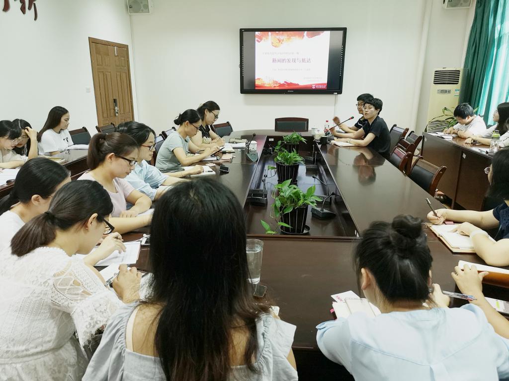 卞成德围绕“新闻的发现与抵达”,结合校园实例,从“什么是新闻”“怎么找新闻”“如何写新闻”三个方面进行了讲解。
