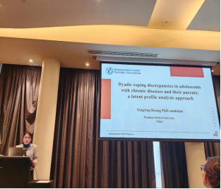 博士研究生黄莹莹同学在会上作题为《Dyadic coping discrepancies in adolescents with chronic diseases and their parents: a latent profile analysis approach》的主题发言。该研究采用潜在类别分析方法,系统探讨了慢性病青少年及其父母二元应对模式中的差异揭示了其与亲子心理适应之间的关联机制为基于家庭韧性的精准干预方案开发提供了重要的理论支持与实践指导。精彩表现,充分体现了学院在研究生国际视野与科研创新方面的培养成效。
