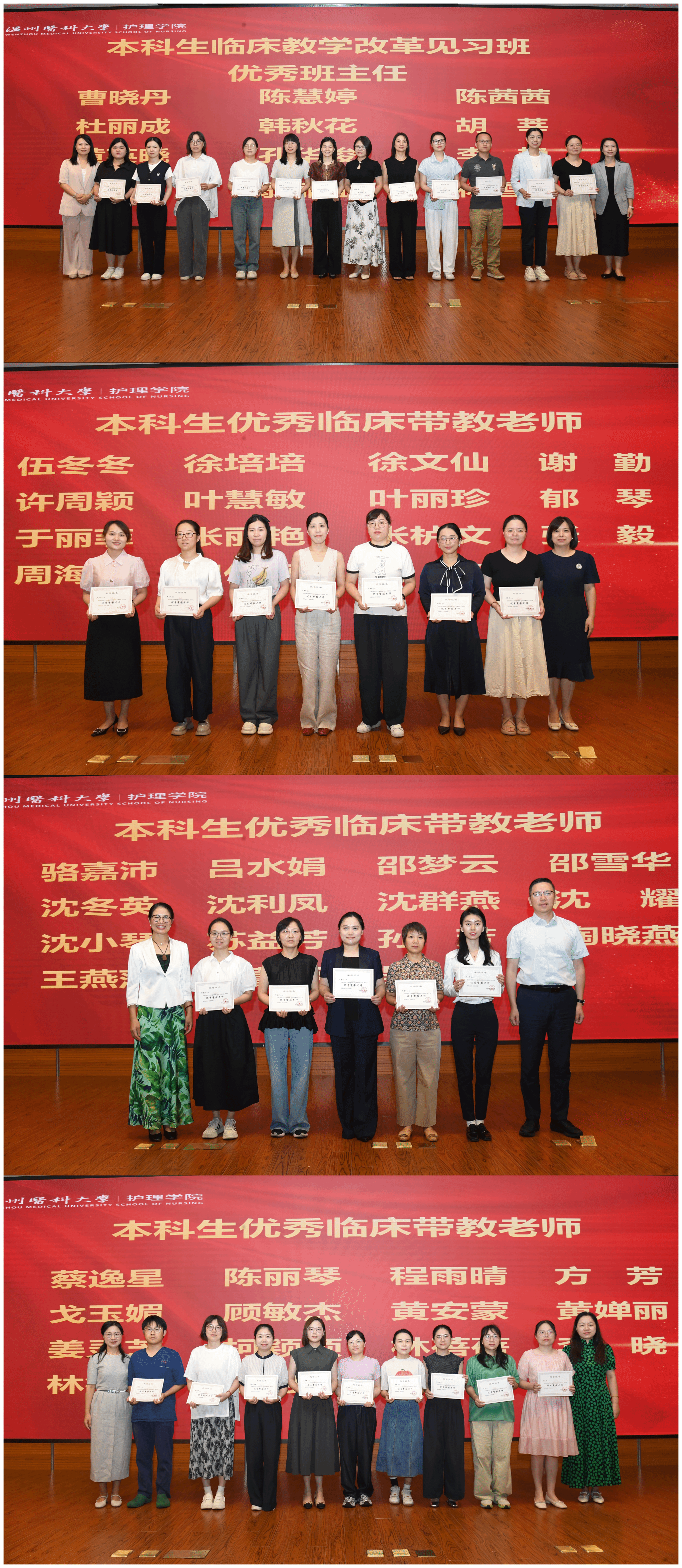 护理临床教学医院及实习基地在人才培养工作中始终秉持高度的责任感与使命感,为护生成长倾注了大量心血。为表彰优秀、树立典型,会议现场隆重举行了颁奖仪式,邀请金伟琼主任、王敏书记、卢丽笋副处长、陈钢副院长、张春梅副院长、金晓童副书记、董超群副院长,分别为本科生优秀临床带教老师及优秀班主任颁发荣誉证书。