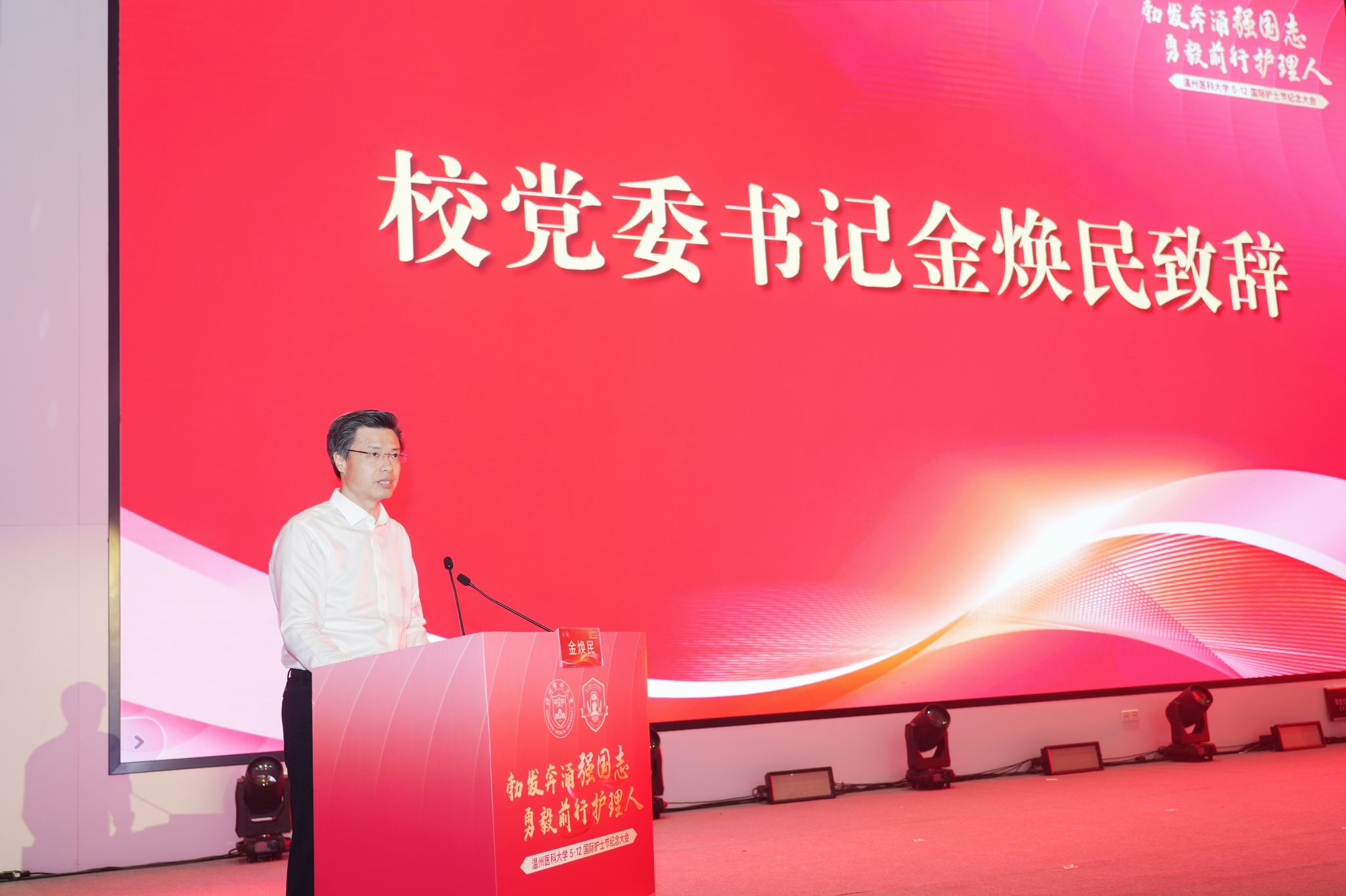 活动在庄严的国歌声中拉开序幕。校党委书记金焕民向温医大全体护理工作者致以诚挚的节日问候和崇高的敬意,向全体护生表达美好的祝福。他勉励护理学子们要以 “专业” 立身,锤炼过硬本领,做理论瀚海的破浪者,提高“一针见血”的技术、“察言观色”的能力,以精益求精攀登护理技术高峰;要以“情怀”铸魂,厚植医者初心,做人文关怀的传灯者,用润物无声的情怀点亮患者希望,滋养生命脉动;要以“格局”致远,勇担时代重任,做健康中国的筑梦者,立足全球视野探索护理新模式,以胸怀天下的格局书写护理事业的时代华章。