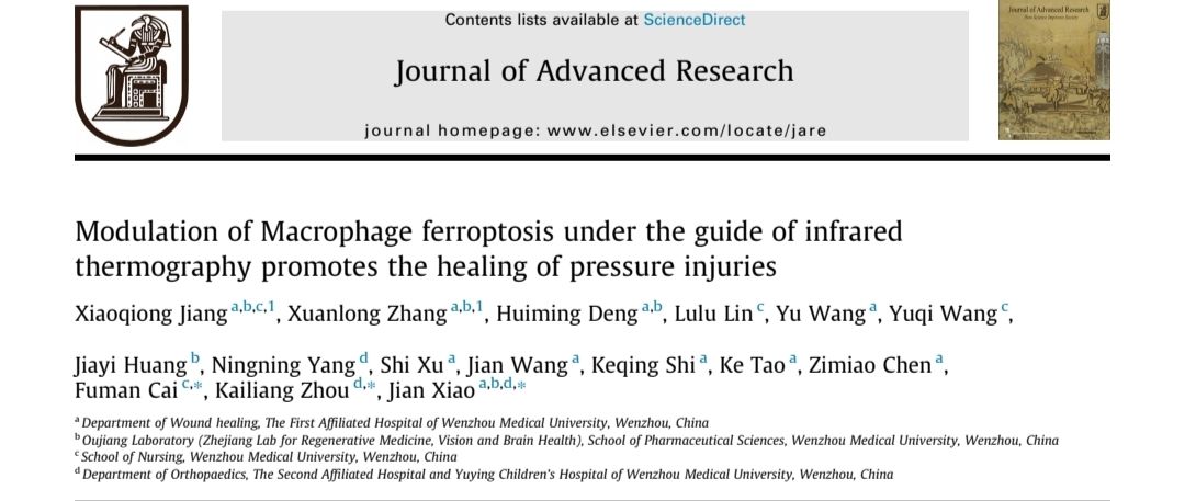 近日,taptap点点官网入口慢性伤口护理研究中心骨干成员江小琼在国际权威期刊《Journal of Advanced Research》(IF=11.4,综合性一区TOP)在线发表题为“Modulation of Macrophage Ferroptosis under the Guide of Infrared Thermography Promotes the Healing of Pressure Injuries”的论著。该研究揭示了压力性损伤修复过程中温度动态变化的新机制,并基于此提出一种可临床转化及居家应用的护理干预策略,为压力性损伤的精准护理干预提供了新范式。