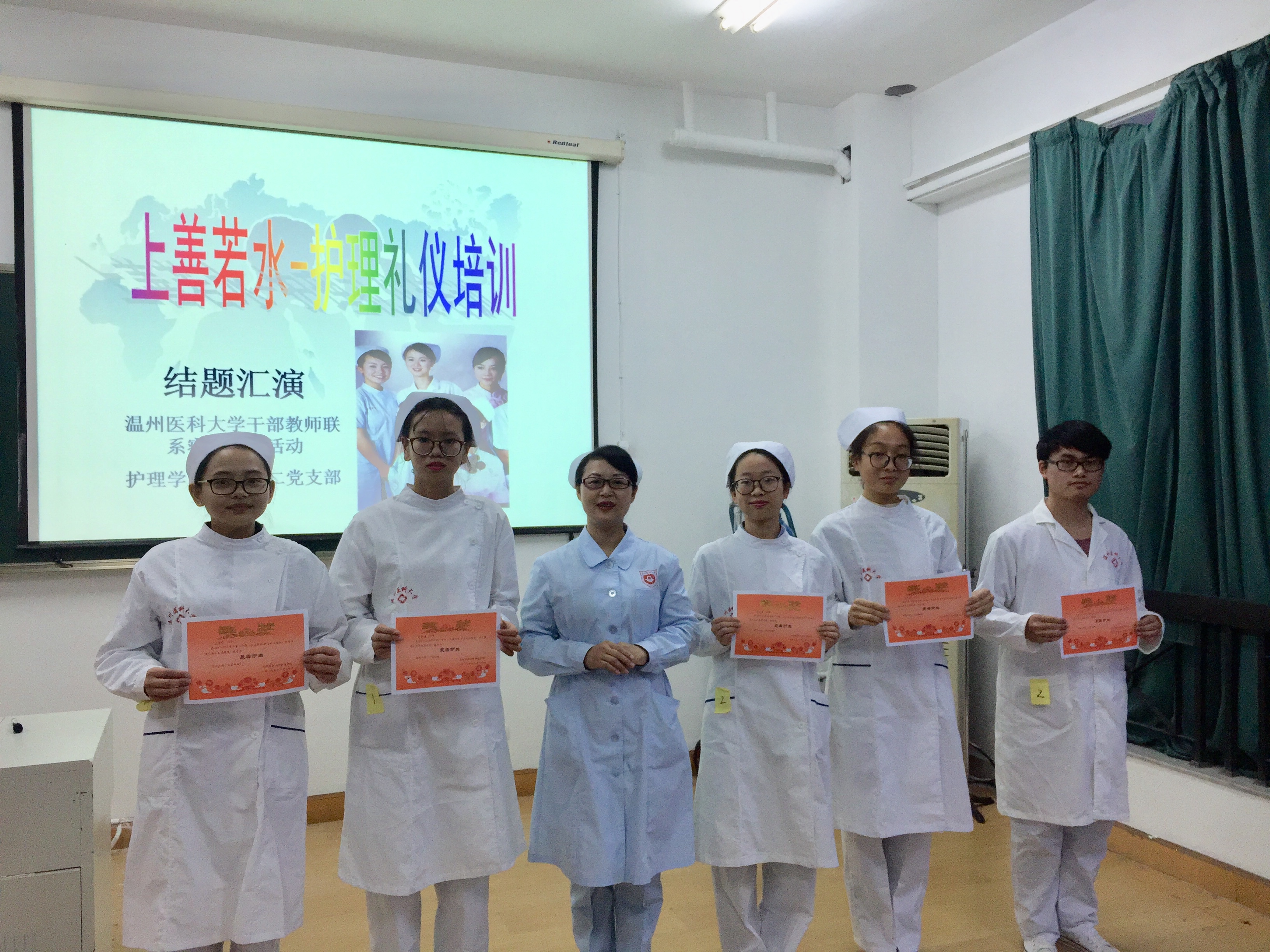 2017年11月20日,taptap点点官网入口教职工第二党支部党员教师集体观看了由16届护理本科3班全体护生展示的taptap点点官方网站干部教师联系寝室精品活动:上善若水——护理礼仪培训的结题汇报演出。16护本3班共6队护生结合护理工作实际特点对仪容礼仪、电话礼仪、礼节礼仪以及礼仪在日常生活、工作中的正确应用等方面做了详细的汇演,向党员教师展示了护士“礼仪”的端庄、优雅魅力。汇演结束后,沈丽娜等6名护生获得“最美护生”荣誉,扬礼队获得“最美团队”称号。