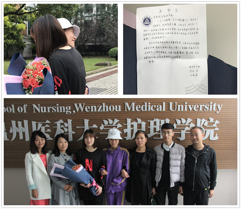 11月14日,校园里,一位头缠纱布怀抱大束鲜花的女生快步跑向另外一位女生并紧紧相拥,这一温情时刻让很多人驻足观看。受伤女生正是感谢信的撰写者、温州商学院大一新生王逸铭。11月12日晚,王逸铭骑着电动车为避让骑着小黄车的学生紧急刹车,因控制不力,人车均摔倒在地,出现后脑勺出血、抽搐、失去意识等症状,现场的人都懵了不知所措,此时,人群中的一名女生走上前去呼叫她,同时紧急拨打120,镇定指挥周围同学把电动车扶起来并指挥行人车辆绕行,直到救护车到达现场,陪同受伤者一起到医院,检查观察,无碍之后才离开。在王逸铭师长询问其姓名等信息的时候,她说,“这是每一个温医大的同学看到都会做的,人没事就好,不必言谢。”就离开了。后来,他们多方打听,这名白衣天使就是taptap点点在读学生应家欣同学,于是来校表示感谢。王逸铭及其师长均表示能够在紧急关头伸出援手予以正确的处理,是一种正能量,必须要感谢。