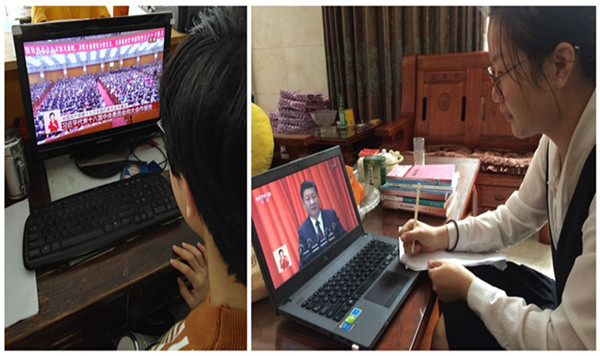 上午8:50,老师们带着笔记本准时来到学院会议室,党员教师们还佩带了鲜红的党徵。在收看的过程中,老师们跟着大会安排,庄严起立唱国歌,为革命前辈和革命先烈默哀,全程认真聆听了习近平总书记代表第十八届中央委员会所作的报告。同学们则更早地来到7C302、7C202两个教室认真收看。学生第七党支部预备党员董玲美在浙江省台州医院实习,下班路过打印店正值开幕,当即就坐在打印店电脑前进行了收看。