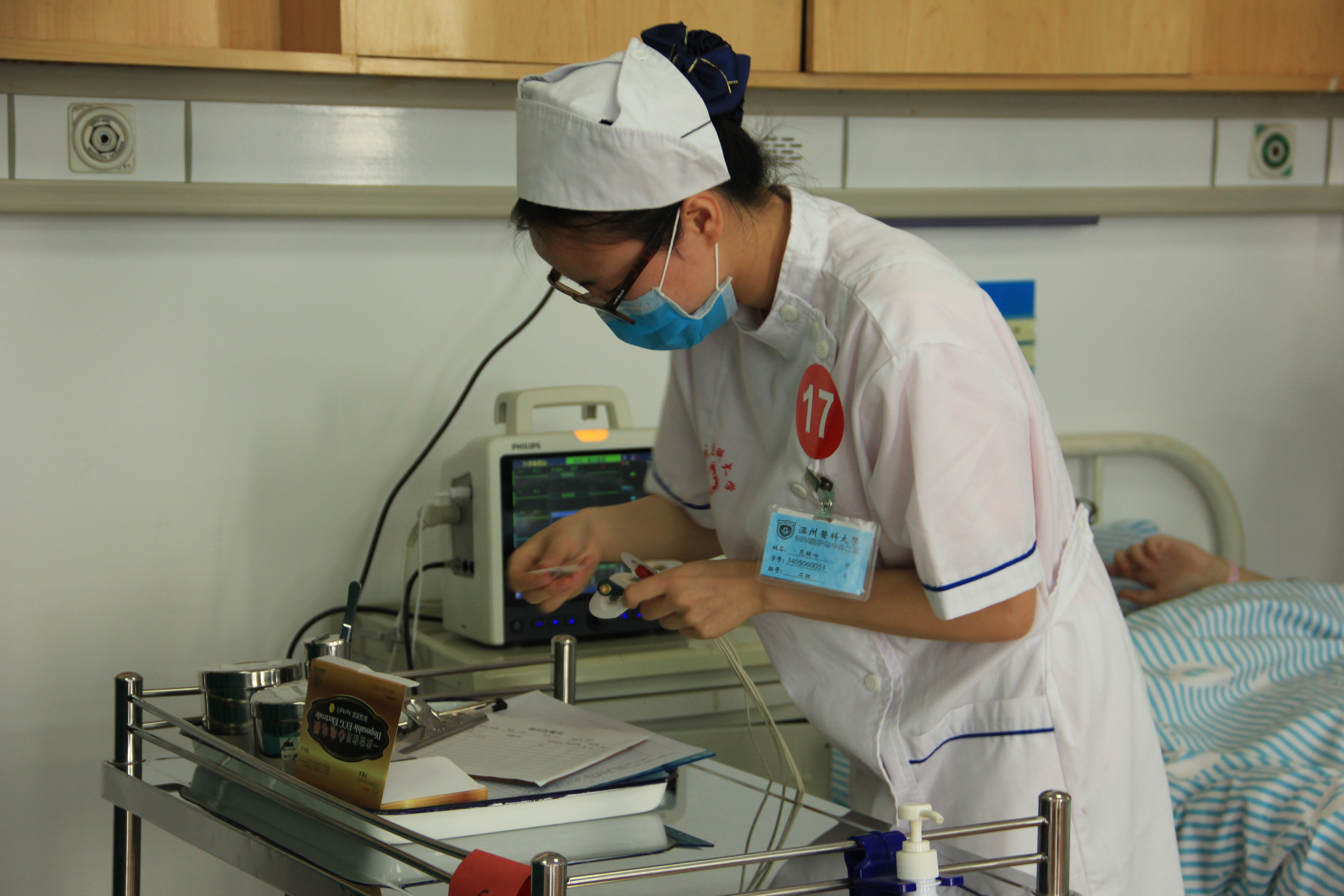 6月18日8:30,操作考核在7C208拉开序幕,考核内容为心电监护,所有选手被分为三组,按照抽签的序号依次进行操作。“老师,我准备好了,请问可以开始操作了吗?”“可以”选手们一丝不苟地按照步骤完成了整个操作过程,时间控制在13分钟内。此次操作面对的对象是真人模特,选手们十分认真,操作中还不忘回答“病人”提出的问题,让人仿佛看到了真实的临床现场。比赛有志愿者全程录像,要求选手尽量在限定的时间里完成技能操作,此外,每一床都有两位老师全程跟随,根据选手的操作情况进行打分。