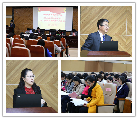 在第一次全体会议上,院长卢中秋代表学院向大会作工作报告。报告指出,过去一年,全院师生锐意进取,各方面工作获得了新的进步与提升:人才培养工作成效明显,师资队伍建设不断加强,学科建设水平有所进步,教育国际化进程加快推进,社会服务能力继续提升,党的建设工作扎实推进,思想文化建设开创新局面。报告强调,去年迎接教育部护理学专业认证,学院清晰的办学思路,齐全规范的教学资料,扎实的教学技能,井然有序的实验室管理,赢得了认证考察专家的高度认可,顺利通过了认证,极大地鼓舞了学院继续前行、再创辉煌的信心。但我们同时也要清醒地认识到,当前学院面临新的发展机遇,也面临很多困难:高水平学科带头人、专业带头人严重缺乏;护理学专业特色和优势不够凸显,中外合作人才培养模式需要进一步改进;学科建设和科研水平迫切需要提升;学院和医院院院合一的工作机制需要进一步加以深化和推进等。