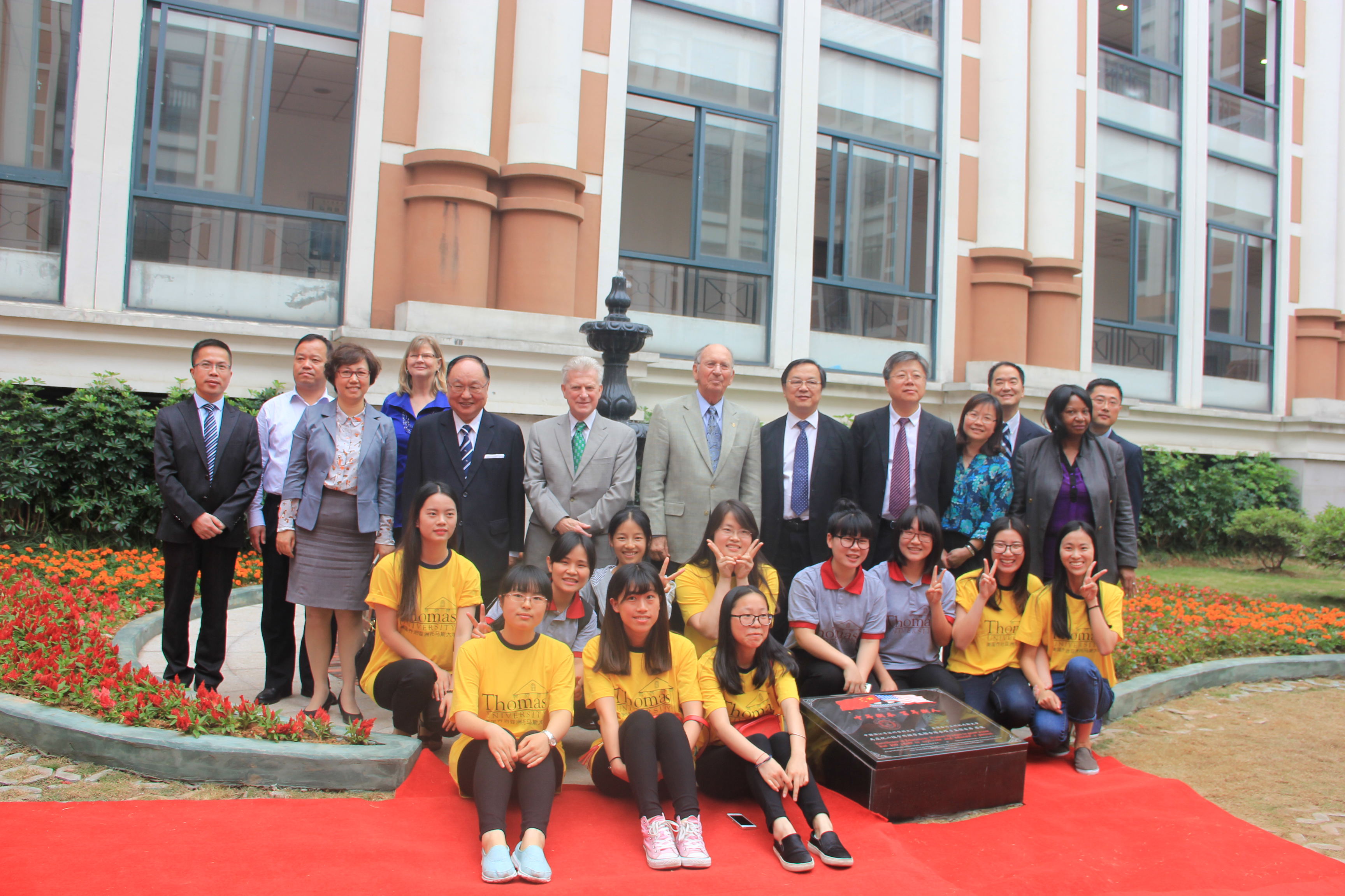 “本次仪式既是我校与美国托马斯大学合作交流开花结果的标志,也是我校教育国际化工作不断深化的结果。”瞿佳校长在致辞中如此恳切地说道,并诚挚地期望在今后合作办学的基础上,进一步在师资培养、科研合作等方面开展更广泛的交流。邦威廉校长在发言中表达了本次来访对同学们的祝愿,并感谢所有的同学与教职工们为这份事业所付出的努力。随后,瞿佳校长,格伦董事长,邦威廉校长等一同携手完成了友谊喷泉的揭幕仪式,寓意两校友谊之水源远流长。盖瑞·邦威廉博士还现场为我校校长瞿佳等人颁发托马斯大学2015年度国际教育终身成就奖,以感谢他们为促进中美两国高等教育交流和合作所作的卓越贡献。最后,师生们一同欢唱《友谊天长地久》,并在友谊喷泉旁留下了合影。