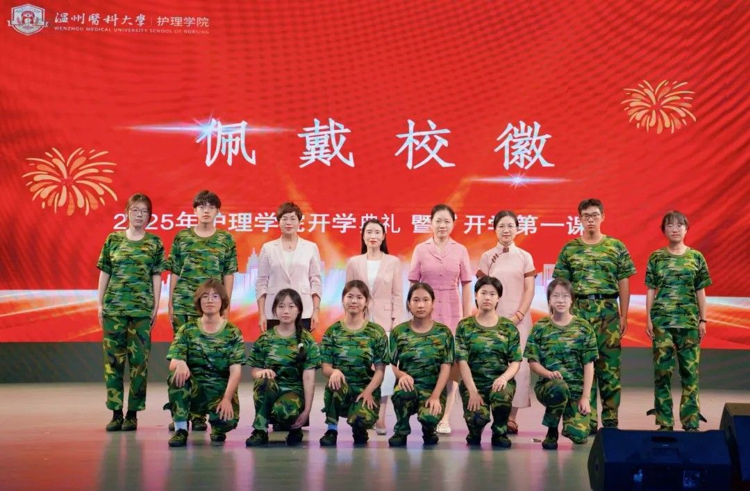 在庄严的氛围中,举行佩戴校徽仪式。院领导为新生代表亲手佩戴校徽,这枚小小的徽章承载着期许与祝福,标志着新生正式开启护理学习征程,今后将以温医学子身份肩负使命、传承校魂。