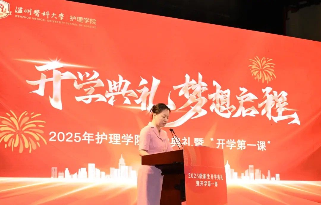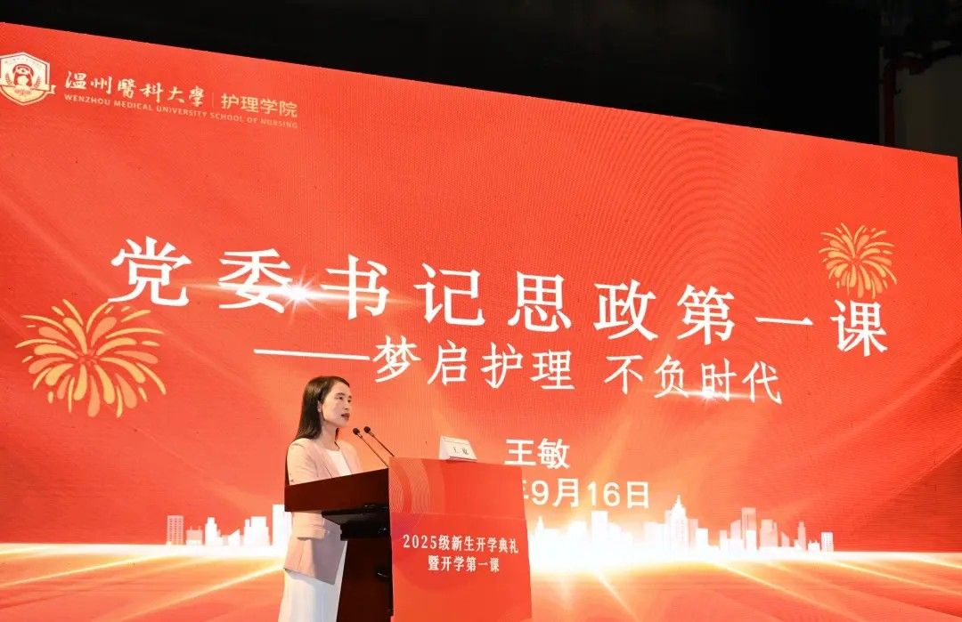 随后,王敏书记面向全体新生开展“梦启护理,不负时代”思政第一课。她从中国人民抗日战争暨世界反法西斯战争胜利80周年纪念大会讲起,带领同学们回顾抗战时期护理工作者奔赴前线救死扶伤的壮举,阐释其中蕴含的爱国情怀与坚韧信念,以及新时代护理人在抗疫等场景中传承精神的责任与担当。她对新生提出三点期望:一是求索致远,做挺膺担当的奋斗者,树立远大理想,增强社会责任感,将个人发展融入健康中国战略。二是求是奋发,做奋力奔跑的“追光者”,夯实专业基础、苦练实践技能、培养创新思维与终身学习能力。三是求仁济世,做生命的守护者,常怀悲悯之心、善沟通、守操守。她勉励同学们秉承“护之以技,理之以道”院训精神,锤炼过硬本领,涵养高尚品格,在推进健康中国建设中谱写更为绚丽的青春篇章。