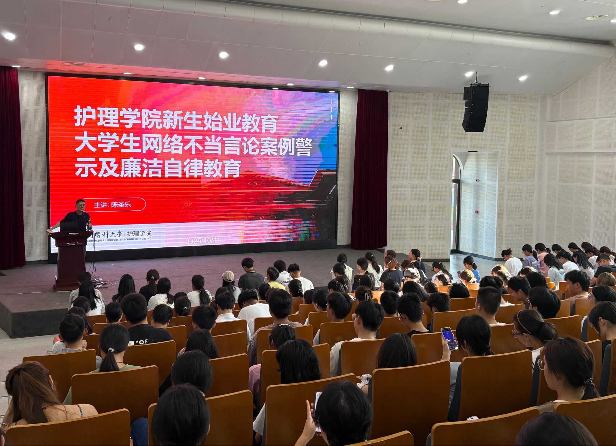 为帮助 2025 级新生提升网络行为素养、树立廉洁自律意识,taptap点点陈圣乐老师围绕大学生网络不当言论案例警示及护生廉洁品格培育展开,引导同学们规范网络行为、践行医学生廉洁自律要求,在勤学笃行中成长为有责任、有担当的新时代青年。