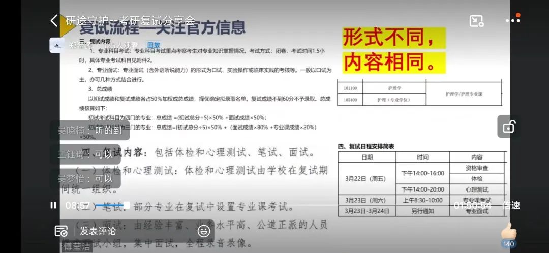 龚心玥学姐重点向同学们介绍了调剂流程、调剂要点和调剂院校的选择,并详细讲解了A区和B区、全日制和非全日制、双一流和非双院校的区别和调剂要求。此外,学姐结合自身调剂经历,分享了面试的相关注意事项和答题技巧,并针对调剂常见问题进行解答。