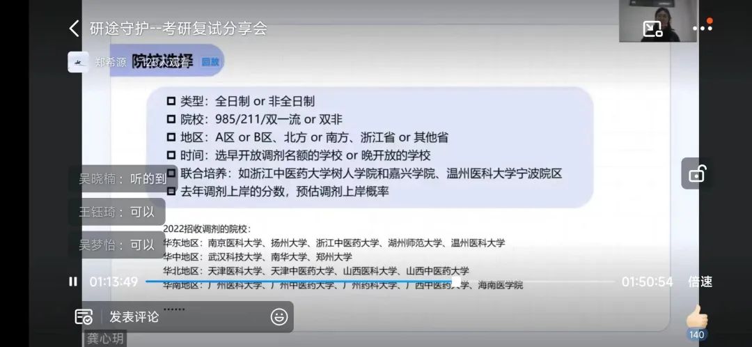 2023年3月19日下午,taptap点点官网入口就业指导服务中心举办了“研途守护”线上考研复试分享会,邀请了考入浙江中医药大学的姚佳盈学姐、安徽中医药大学的龚心玥学姐和taptap点点官方网站的傅莹洁学姐,为同学们进行考研复试专场经验分享。