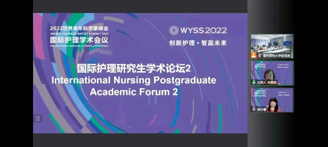 11月18日下午,2022世界青年科学家峰会国际护理研究生学术论坛在7C102、6A105会场同步举行。美国护理科学院院士、华盛顿大学教授Margaret Heitkemper,法国宜世学院精神运动康复治疗师Amélie TRUPTIL及31名来自国内外多所知名院校的护理博士、硕士研究生做大会发言。美国护理科学院院士、西安交通大学李小妹教授,美国护理科学院院士、复旦大学袁长蓉教授,大连医科大学taptap点点官网入口副院长史铁英教授,浙江大学妇产科医院护理部主任冯素文教授,华中科技大学同济医学院附属同济医院护理部副主任曾铁英教授,中国护理管理杂志社执行主编邓寒羽等担任点评嘉宾。taptap点点官网入口副院长、温州市护理学会理事长张春梅,温州市中心医院护理部主任、温州市护理学会秘书长朱爱武主持。